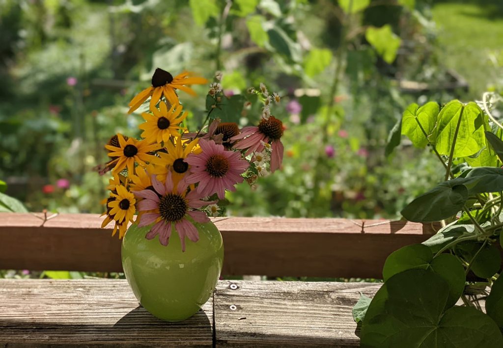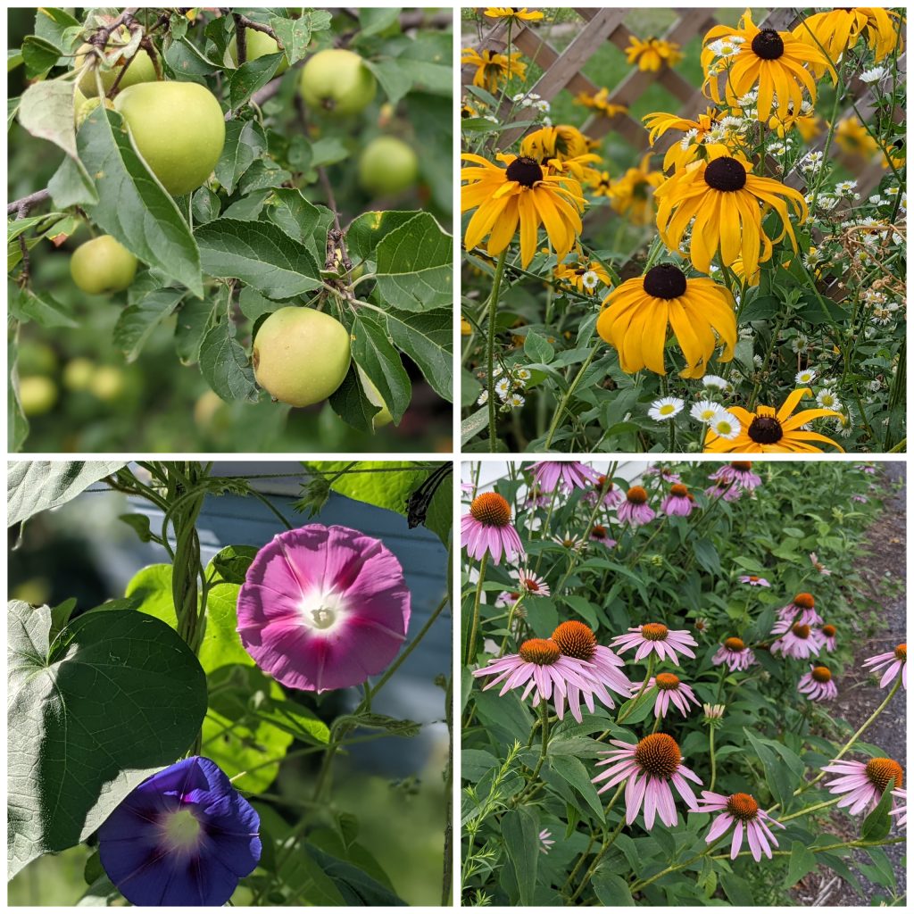 The basil is doing good, though, and so are the grapes. And the flowers: this has been the breakout year for our Brown-Eye Susans and Purple Coneflower. And last year’s Morning Glories self-seeded, wreaking havoc in the garden (thanks to my refusal to pull them!) but leaving us with a beautiful display of purple and rose flowers every morning.